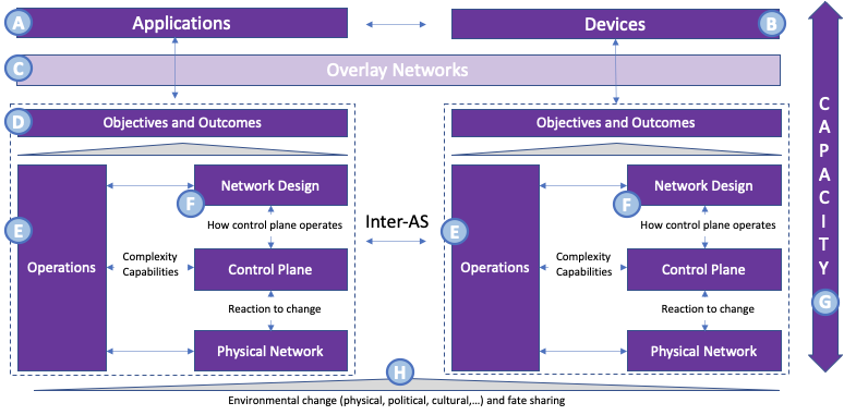 The big issue that emerges when the whole problem is looked at, is the many dynamic components that impact the reality of networking outcomes. Figure 1 lists some of them, A to H. Even if a great job is done at specifying and implementing the control plane and physical network, there is a great deal more going on that comes down to the capacity, capabilities, and choices made with respect to other elements. A well implemented control plane can collapse if the network design is not done well. An operations function can be overwhelmed depending on the protocol and design choices. As the industry studies the strategic options in networking, digs more into the dynamics of complexity, a picture emerges of an interdependent ecosystem that expands well beyond the network itself.